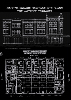 The Watkins’ Terrace was constructed in 1876 on a site bounded by Hay, George and Campbell Streets and Parker Lane, In the early 1990s, the whole block between Pitt Street and George Street became the Capitol Theatre Heritage Precinct. The Watkins’ Terrace was approved for partial restoration and redevelopment as part of the precinct by First Scope Development Pty Limited.